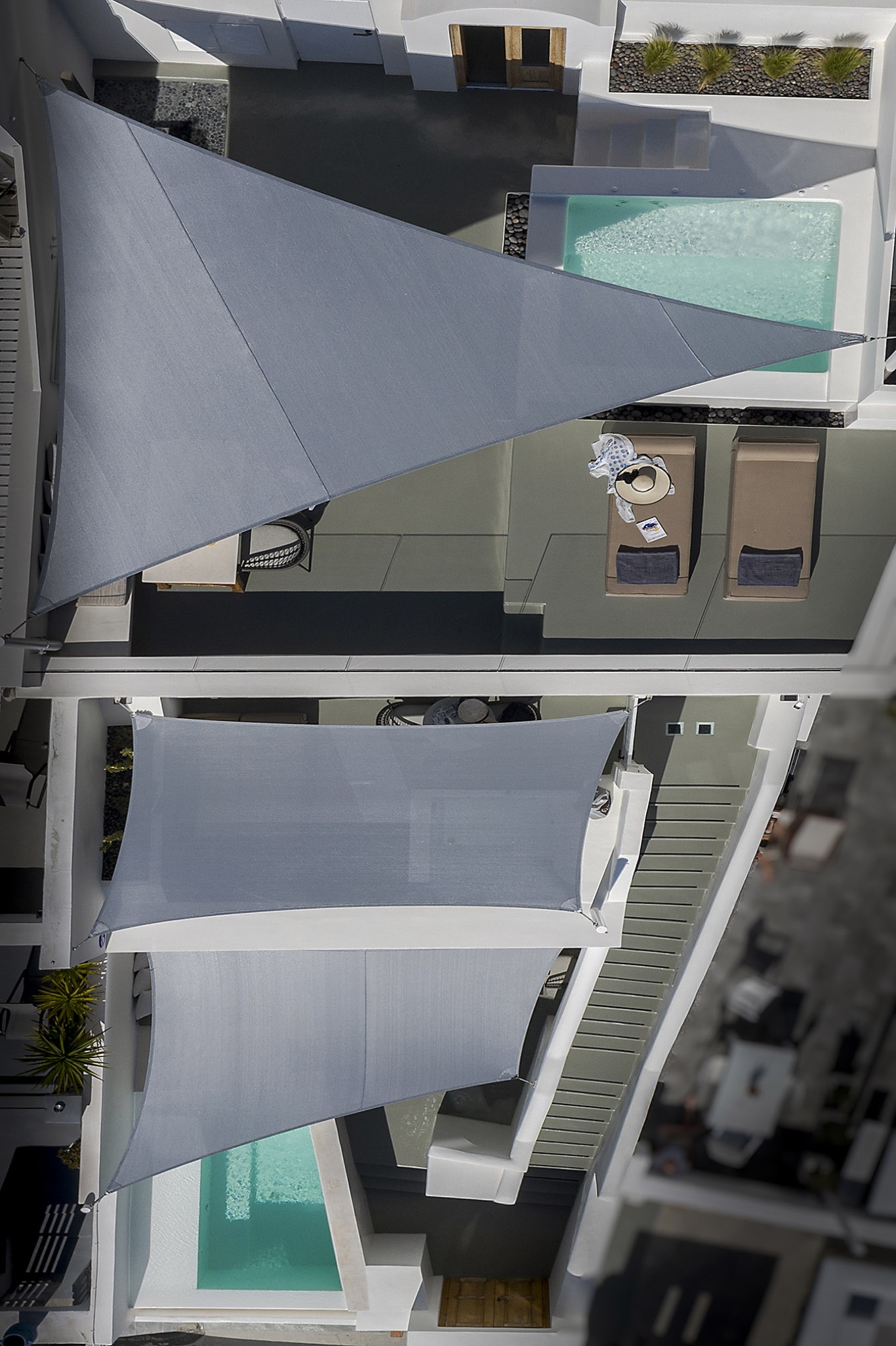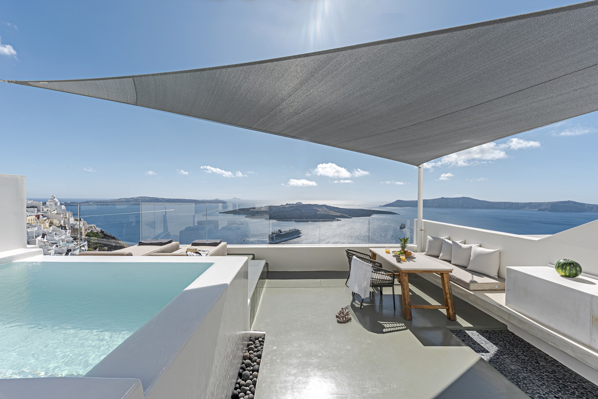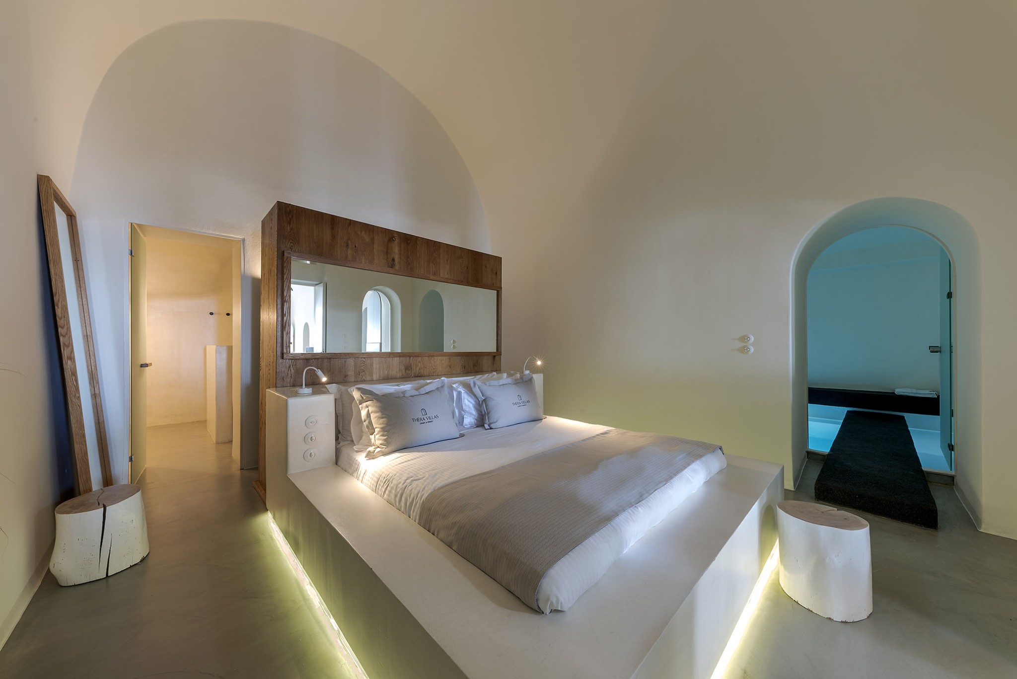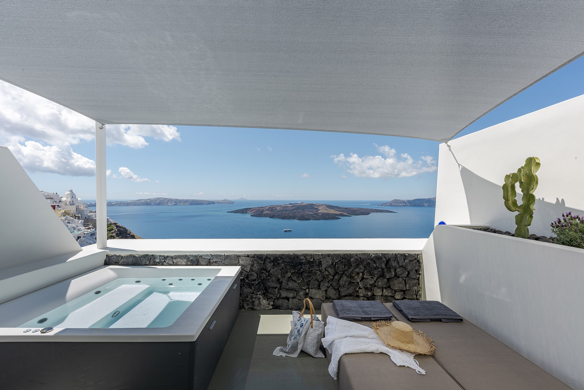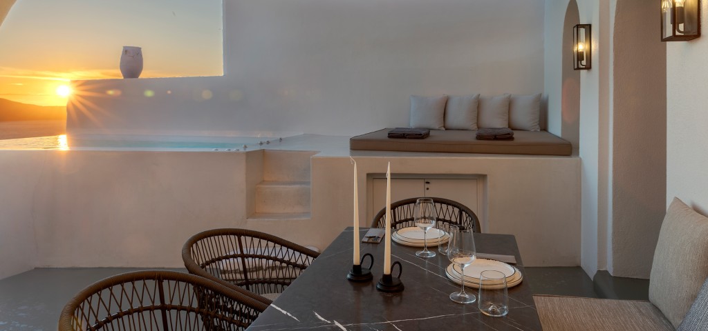 Thera Luxury Villas is a magnificent shelter, offering unforgettable villas holidays vacations on the beautiful island of Santorini. The villas feature stylish interiors and high quality finishes, fixtures and fittings, to provide a unique experience of airy, laid back luxury complemented by dynamic sunset sea views. Τhe three villas that are located on the hillside overlooking the deep blue Aegean Sea. Each villa is completely private with its own entrance and it does not share any space unless they have a reservation for all three together.