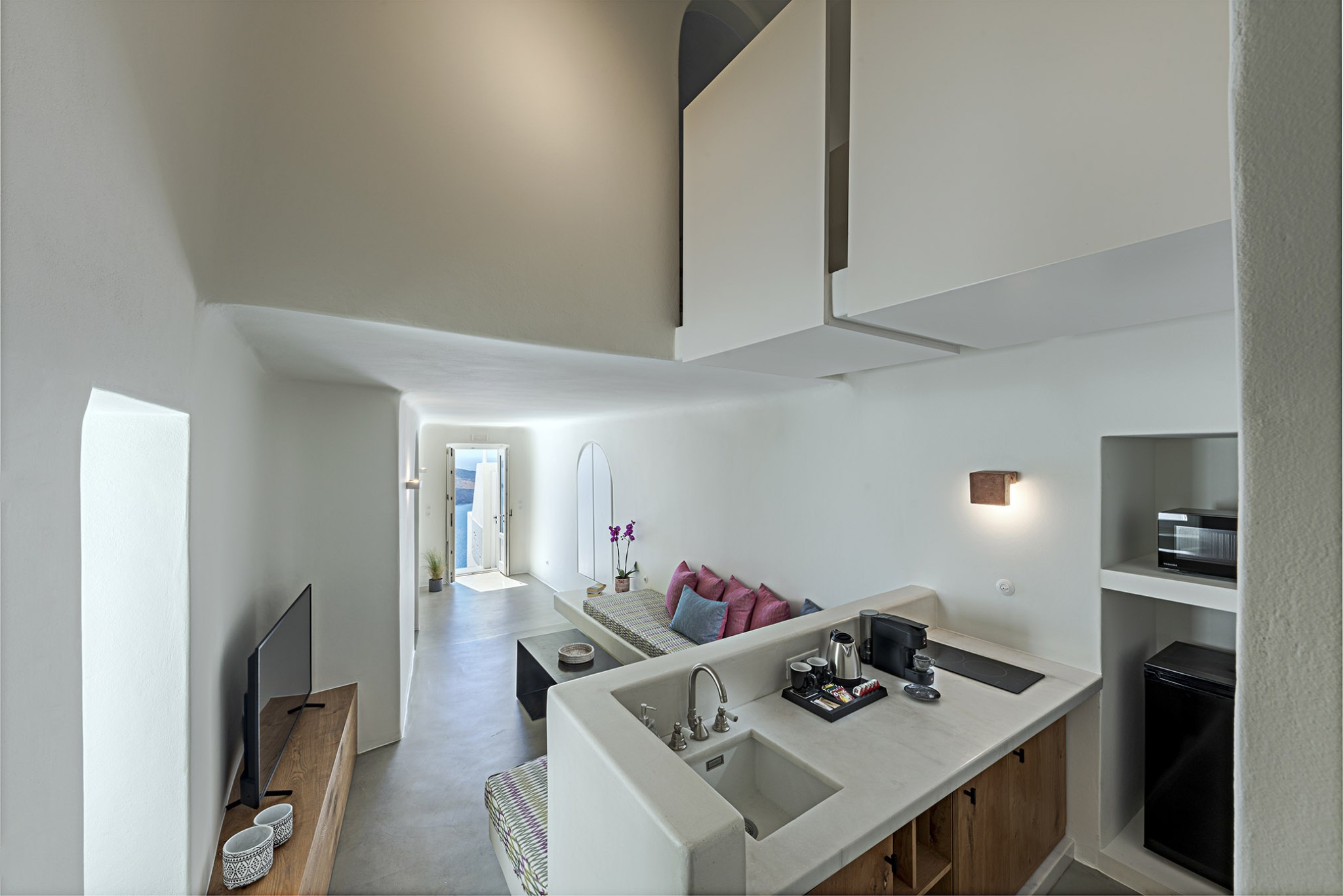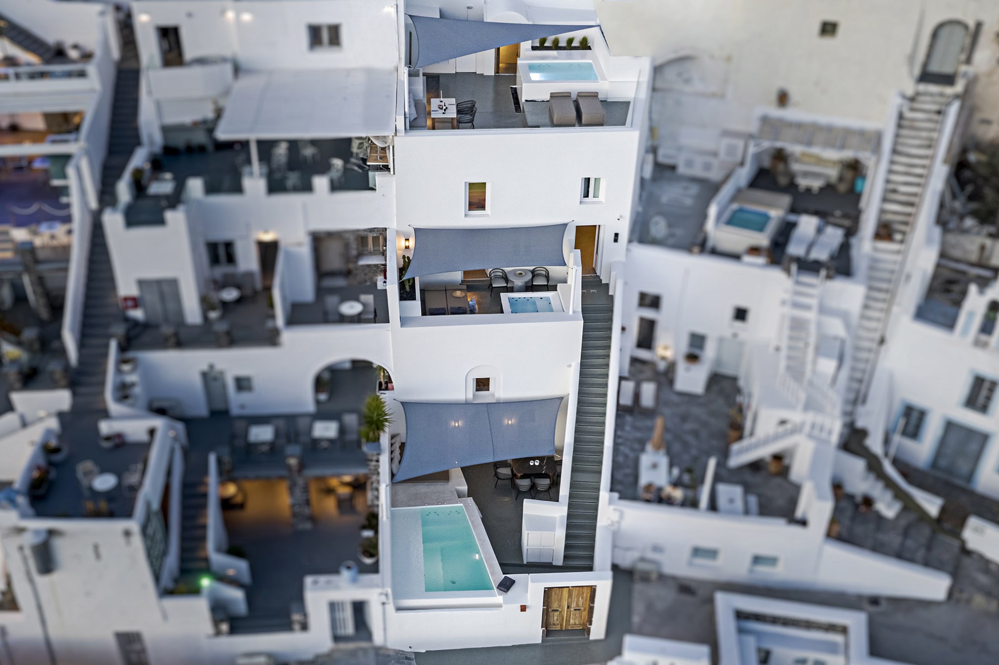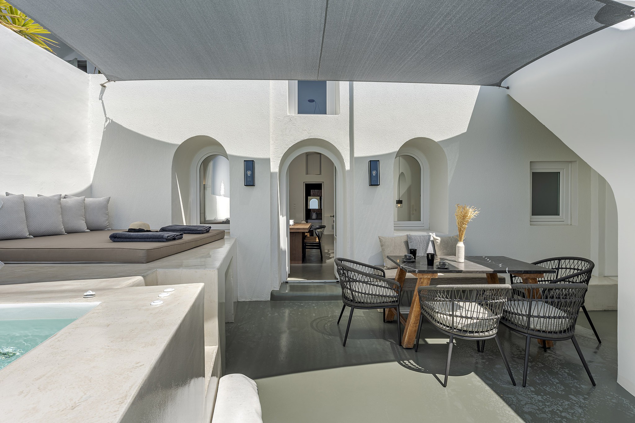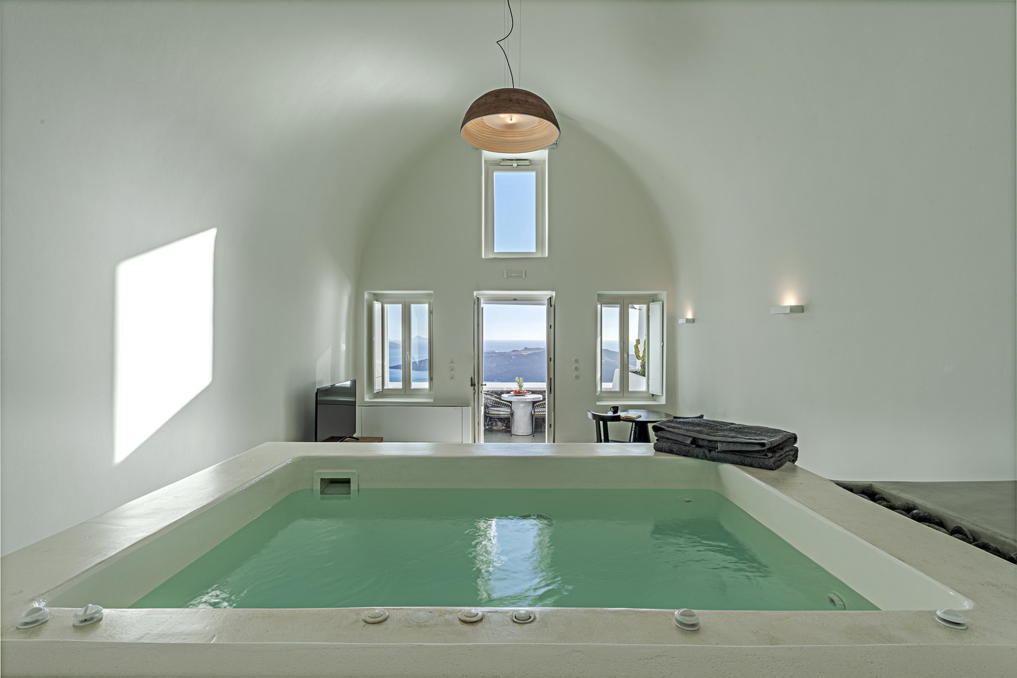 Thera Luxury Villas is a magnificent shelter, offering unforgettable villas holidays vacations on the beautiful island of Santorini. The villas feature stylish interiors and high quality finishes, fixtures and fittings, to provide a unique experience of airy, laid back luxury complemented by dynamic sunset sea views. Τhe three villas that are located on the hillside overlooking the deep blue Aegean Sea. Each villa is completely private with its own entrance and it does not share any space unless they have a reservation for all three together.